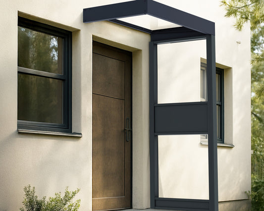 Augustine Door Awning 35" x 131" Black Frame Grey Panels | Palram-Canopia